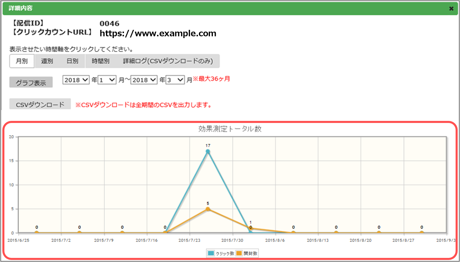 開封数をクリックすると、CSV形式で開封数の集計データがダウンロードできます。
